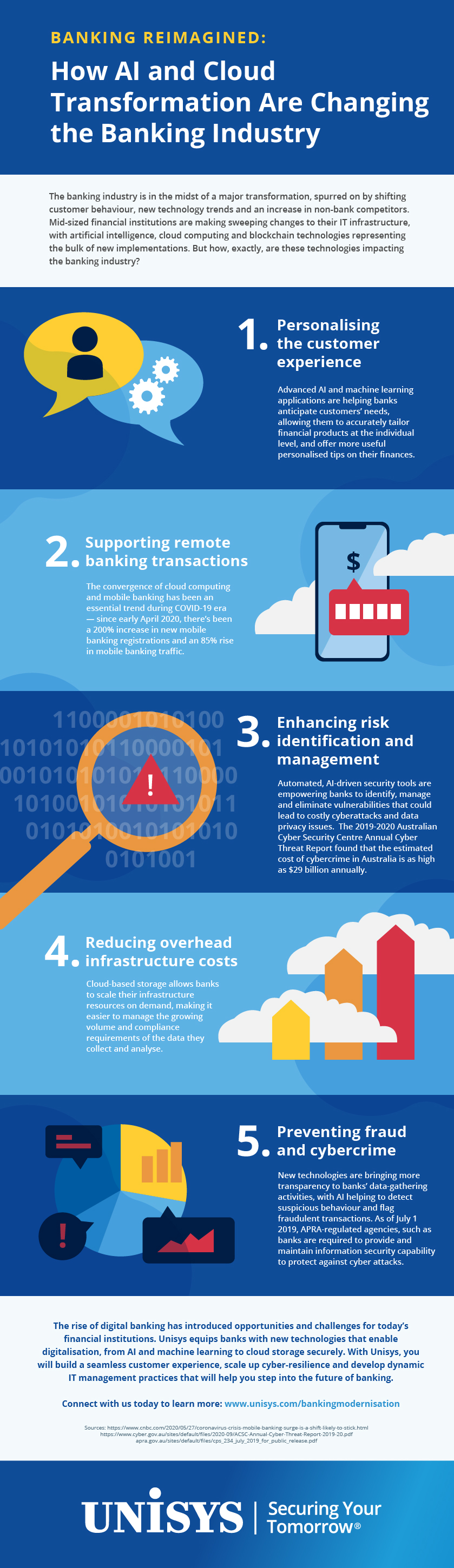 Unisys works alongside financial institutions to simplify your legacy environment for cloud transitions, provide a customer first digital experience, quantify and understand cyber risk to strengthen your cyber resilience. Working with Unisys digital transformation experts, you can adapt your digital workplace, secure cross-functional buy-in from key stakeholders and align your organisational goals with new AI and cloud technologies.