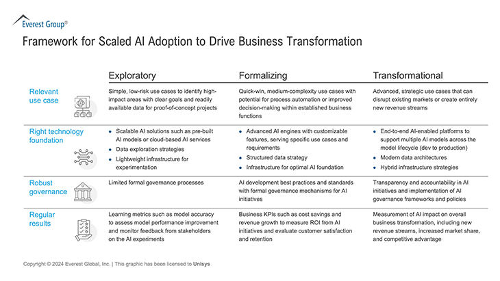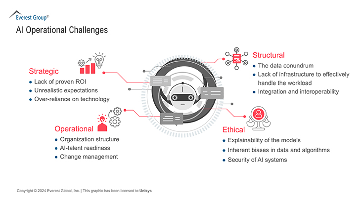 While the exponential growth in AI adoption is a testament to its impact, only a few organizations have successfully unleashed the potential of operationalized AI. According to recent Everest Group estimates, more than two-thirds of organizations investing in AI have yet to realize the intended business impact of their investments. Many organizations run only ad hoc pilots or implement AI in pockets as they struggle with a “scaling chasm” where operationalization remains challenging. The difficulties organizations face can be categorized into the following four themes: